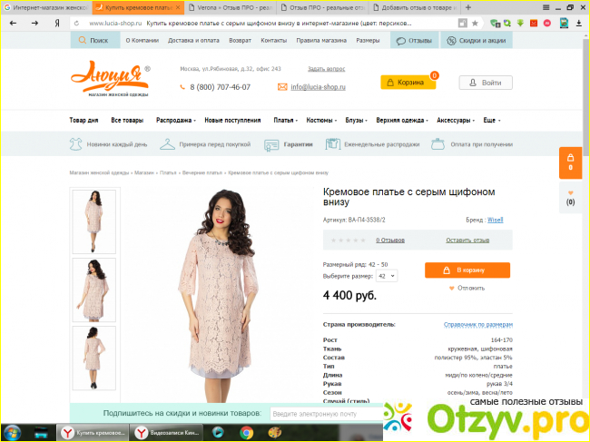 Первый раз когда надумала здесь оформить заказ предварительно на всякий случай позвонила по номеру, предоставленному на сайте, чтобы уточнить все интересующие меня детали. У меня параметры фигуры далеки от стандарта, так как бедра очень большие, тонкая талия и маленький размер бюста, не понятно как сядет та или иная вещь. Расспросила все у консультанта, назвала свои параметры и тот мне посоветовал как лучше всего подобрать платье, чтобы село по фигуре, все недостатки скрыло и подчеркнуло при этом достоинства. Оказались дельными советы, заказала платье и все прекрасно село. Мне нравится здесь так же и то, что очень часто бывают скидки и большие, так что покупать стало еще более экономно.