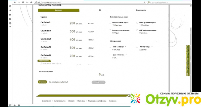 Подключиться я решила к данному поставщику связи, выбрав тариф ОнЛайм 60, при котором я получала wi-fi роутер за ноль рублей, а за скорость шестьдесят мегабит в секунду в месяц необходимо платить двести пятьдесят рублей. По мне, это один из самых оптимальных тарифов по стоимости и по скорости. Я, кстати, проверяла скорость через онлайн-тест — она действительно соответствует заявленной. Хотя по вечерам всегда начинает падать. Но я так понимаю, это из-за сильной нагрузки на сеть (хотя я не уверена, ибо до конца не разбираюсь во всех тонкостях).