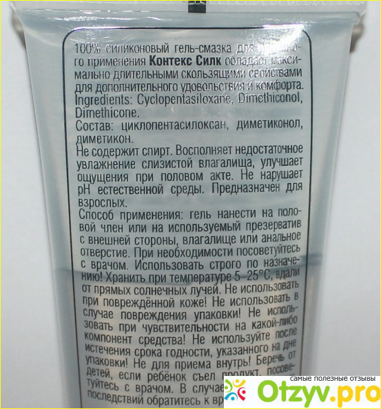 В составе указаны несколько компонентов: циклопентасилоксан, диметиконол, диметикон. Первый компонент является, собственно, силиконом. Имеет синтетическое происхождение. Благодаря ему обеспечивается ощущение гладкости. Потому смесь, хотя и похожа на маслянистую, но на самом деле в ней отсутствует жирность. Диметиконол - тоже синтетическое вещество (силиконовый полимер), которое может заполнять мелкие трещинки и поры. И при этом вещество вообще не разлагается в природе. И диметикон - жидкий силикон, свойства у него практически такие же, как у предыдущего вещества. В общем, смазка - полностью синтетическая. И не зря же производитель указал на тюбике - "100% силикон".