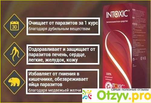 Принцип действия Intoxic выглядит следующим образом: целебные активные компоненты средства уничтожают гельминтов и паразитов, а также их личинки.