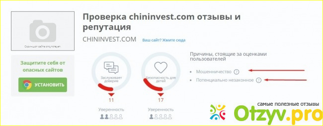 Все, что описано выше - были плюсы. теперь о минусах. Есть такой сайт, "доверие в сети". Там можно проверить сайт "на вшивость", узнав, какой у него процент риска, то есть стоит с ним связываться или нет. Так вот о сайте chininvest.com.