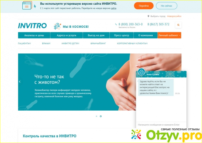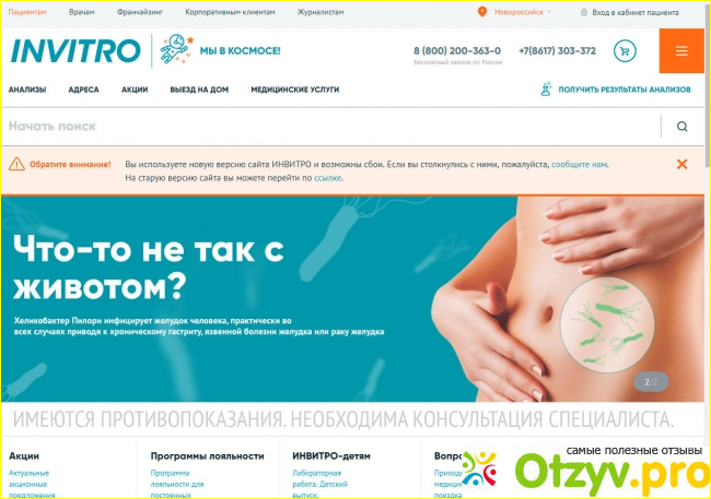 Головной офис располагается в Москве, но работает огромное количество филиалов по всей стране, в том числе и в г. Новороссийск. Официальный сайт медицинской лаборатории располагается по адресу: invitro.ru.