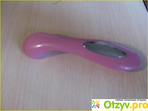 Работает аппарат от круглой батарейки-таблетки, поверхность я закрываю пленкой, которая была при покупке его от царапин, прибор приятно расслабляет лицо при поглаживании по массажным линиям, приятно жужжит и вибрирует.