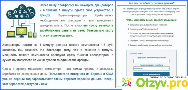 Сайт предлагает заработать всем желающим на сдаче своего компьютера. При чём деньги которые он предлагает соблазнили бы практически всех, ведь вы получаете двадцать пять тысяч рублей за "ничего не делая". Просто "отдал" своё железо в пользование и греби бабло. Не настораживает?