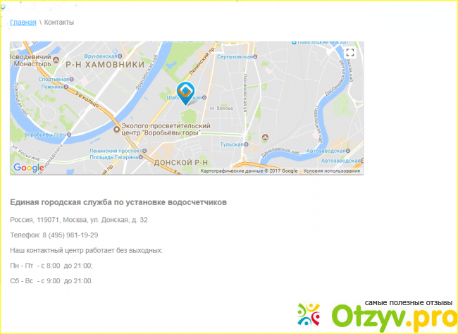 Последняя вкладка посвящена контактной информации, то есть здесь указано, как можно связаться с сервисным центром, а расположен он в городе Москве на Донской улице. Также здесь указаны часы работы этой фирмы и телефон для связи напрямую.