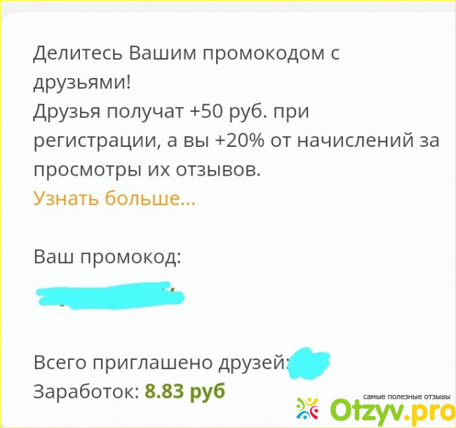 Существует реферальная программа. Друзья, которые ввели ваш промокод при регистрации, получат 50 рублей на счёт, вы +20% от начислений за просмотры их отзывов. Активные всего два. Первое время я активно их искала, потом поняла, это пустая трата времени. Два реферала, принесли мне почти 9 рублей. За время их поиска я могла больше заработать на написании отзывов.