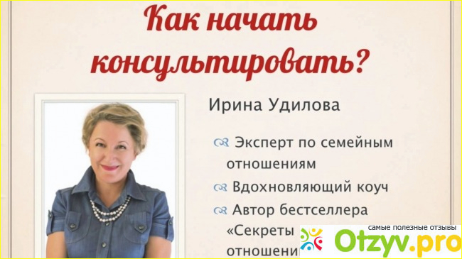 А ведь иногда для успокоения души мы ищем человека, с кем хотелось бы поделиться своими проблемами. Но и сами же потом жалуемся, зачем лезете в мою жизнь и прочее. Уж столько негатива воцаряется в отношениях между людьми, и проблема семейных конфликтов становится все более популярным в наше время. Из-за этого и высокий процент разводов и накачественных браков. А виноваты в этом только лишь сами мы, потому что человек - это не машина, но особе устройство, за которым нужно следить и ухаживать. А нервы по сути мы портим в первую очередь именно самим себе. Помочь разобраться в семейных противоречиях вам поможет личная встреча с психологом, автором ряда книг по психологии отношений Ириной Удиловой. Вы также можете зайти на ее официальный сайт или канал на ютубе. Сайт мне очень приглянулся, он довольно простенький и в свою очередь очень удобный для пользователя. Здесь вы можете окунуться в ауру добра и любви, можете пройти 35 различных тестов, почитать гороскопы, скачать бесплатно книги, задать собственно вопрос Ирине Удиловой. На канале вы найдете также много интересных видео с ее репортажами и участием, ее уроками о том, как вообще правильно заводить отношения между людьми и стараться его не испортить. Горю желанием, как психолог, познакомиться с данной женщиной и поговорить с ней на различные темы. Ведь даже психологом не удается контролировать свои действия и помощь извне явно не помешает. Сама Ирина очень теплый человек, у нее очень приятный голос, который я слышал на аудио и видео, действительно слушая ее, забываешь о многих ненужных вещах и погружаешься в ауру добра. А теперь давайте я расскажу несколько интересных фактов про Ирину.