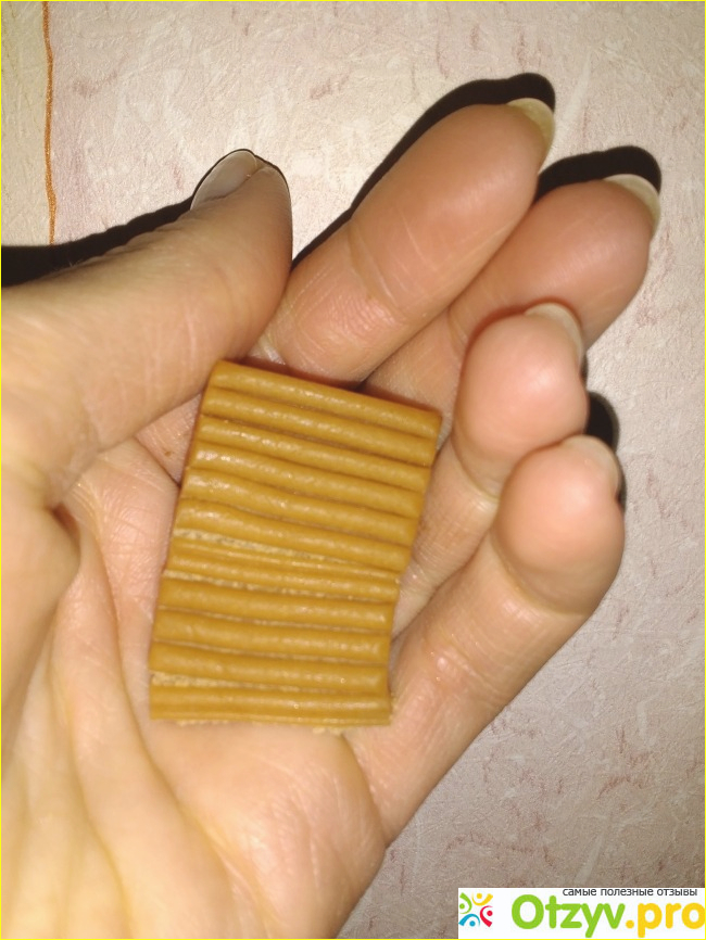 Да и сам ирис выглядит хорошо - это обычная пластинка с квадратиками, которая имеет обычный цвет, как самый обычный ирис - коричневый и запах соответствующий, неплохой. Да и этот ирис мягкий по консистенции, его легко отламывать, откусывать, зубы в нем не застревают. А вот на вкус средне очень, вроде и не совсем все плохо, но и восторга нет, арахис мне тут вообще не понравился, как вата или что-то такое, пикантности не добавляет, рыхлый какой-то арахис.