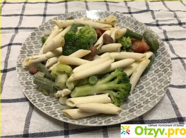 Внутри пачки от ТМ “4 сезона” я увидела замечательные овощи и макароны, которые даже в замороженном виде пробуждали аппетит. Льда здесь не было, только легкая изморось. Соцветия брокколи были небольшими, томаты нарезанные средними кусочками, которые выделялись на фоне других овощей.