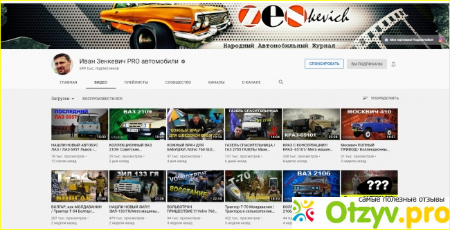 Канал посвящён автомобилям, но не простым, а необычным, редким, ретро и новинкам. Так же имеются прекрасные видео об истории автомобилестроения, документальных фильмах, стрельбе из орудий и даже танк затронут. Отличный канал, здесь обещают завести, даже то, что другие найти не могут, как к примеру такое авто, как Москвич 400-420 К или ЛАЗ 695 Т.