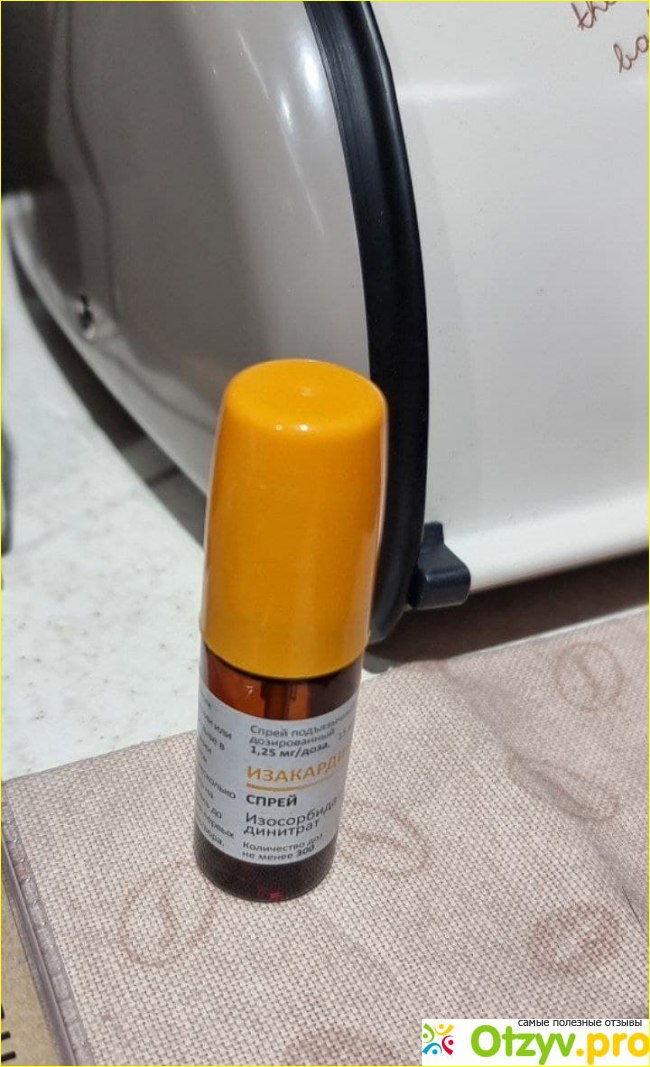 Как оказалось, это маленький флакончик 15 мл с пшикающим наконечником которого хватать должно на 300 доз. В составе: Изосорбида динитрат, вспомогательные в-ва: макрогол, этанол... Эти названия в составе мне ни о чем не говорят, но главное, что один пшик под язык, и через несколько секунд у меня наступает облегчение.