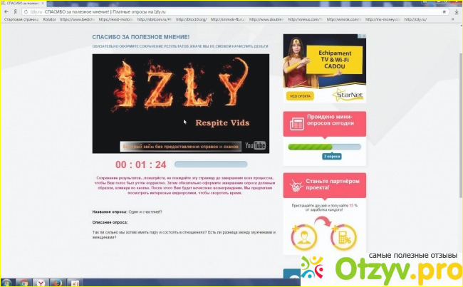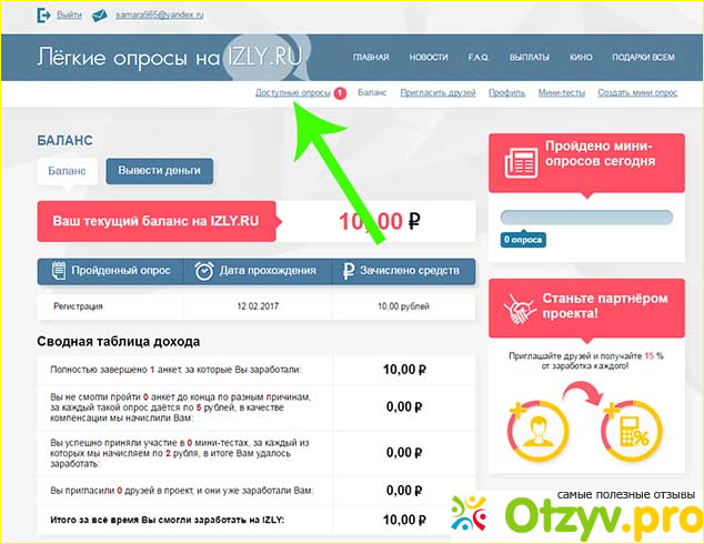 Так случилось 7 месяцев назад что я искал работу на дому и попал на сайт Izly.ru. Схема заработка была довольно простой, за прохождения опросов получаешь деньги. Я как любитель найти работу полегче принялся регистрироваться на сайте и уже поскорее хотел зарабатывать хоть какие-то деньги. Посидев несколько вечеров я набрал 500 рублей за опросы и хотел их вывести, подал заявку, как следует все пересмотрел, а деньги мне так и не пришли. Никто не отписывает из группы поддержки и аккаунт мой так и висит в ожидании выплаты. За одну анкету платили по 30 рублей, а времени на заполнения уходило около 20 минут. Все то потраченное время я мог бы потратить на изучение рабочих документов, но повелся на этот мошеннический проект. С тех я не рассматриваю никакие варианты с заработком в интернете, хотя конечно есть надежные и проверенные сайты которые действительно платят. Может конечно это только со мной приключилось, потому что хочу еще рассказать историю друга, который получил деньги от этого сайта за пройденные опросы.