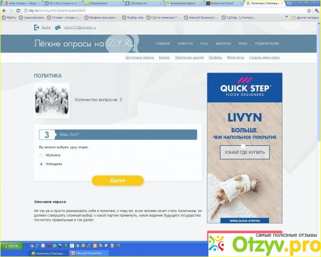 Угораздило меня однажды поверить этому сайту опросов и зарегистрироваться на нем - на сайте Izly.ru. Понравился сам сайт, понравилось наличие на нем ежедневных мини-опросов, благодаря которым можно было в любой удобный для себя момент зайти на сайт и ответить на 5 таких опросов в день, за каждый из которых начисляется по 2 рубля. Получалось, что в любом случае как минимум 300 рублей в месяц набежит, это не считая опросов, которые будут присылать на е-майл.
