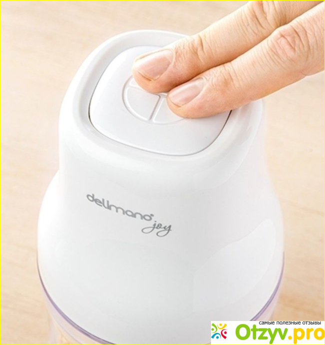 Измельчитель сам по себе небольшого размера, поэтому легко поместится на кухонном столе. Он разработан таким образом, что им можно пользоваться одной рукой - достаточно нажать кнопку на верхней части устройства и он начинает работу.
