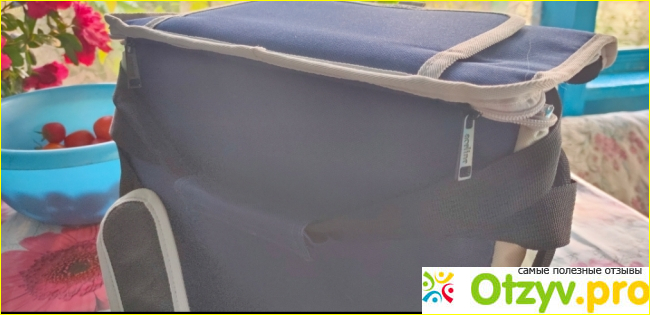 Сумка объёмом 10 л. Внутри фольгированный полиэтилен, или что-то в этом роде. Заявленная производительность удержания температуры до 6 часов. Имеются два кармана для небольших вещей и удобная ручка для переноски. Основная секция большая одна на 10 л., раскрывается удобно. Всё на молниях и липучках.