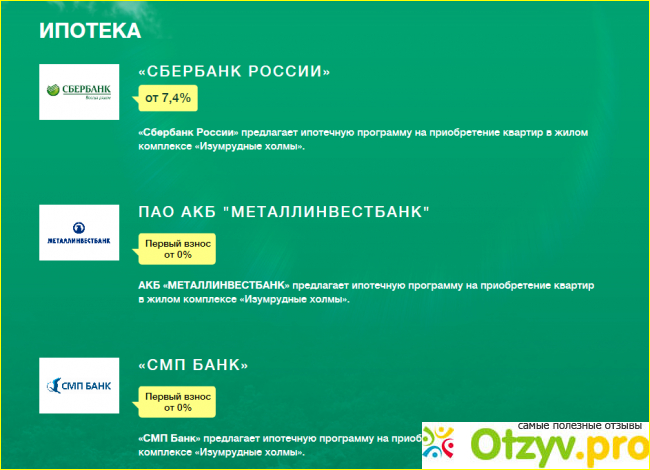 На сайте ЖК Изумрудные холмы я вижу очень много размещено банков-партнеров, их около 19 штук, у каждого покупателя таким образом есть выбор довериться проверенному своему банку.