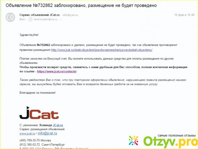 На следующий день открываю свою почту и о чудо )) вижу письмо о том, что мое объявление заблокировано модератором по причине каких-то нарушений, с угрозами, что если это повторится, то мои деньги они заберут себе просто так. Вот письмо: