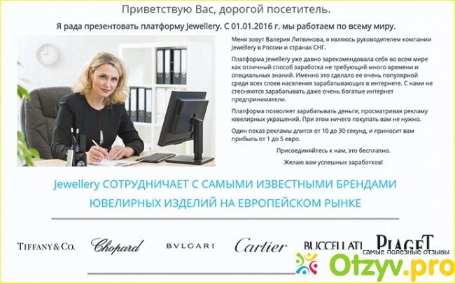 На сайте обещают неплохой заработок, на просмотре рекламы ювелирных украшений, пользователю обещают около 50 евро в день (весьма неплохо ведь). Сам сайт неплохо оформлен, в списке партнеров указаны известные мировые бренды, выглядит неплохо и заманчиво. Есть возможность просматривать сайт на нескольких языках. На сайте представлено видео, где некая Валерия Литвинова рассказывает о заработке. При регистрации, в личном кабинете пользователь накапливает на просмотре видео 50 евро. Реклама разбита на статусы, например VIP ролики перематывать нельзя, но они стоят дороже. Здесь мы и начинаем просматривать ролики, уже предвкушая золотые горы и новенький "Ferrari".