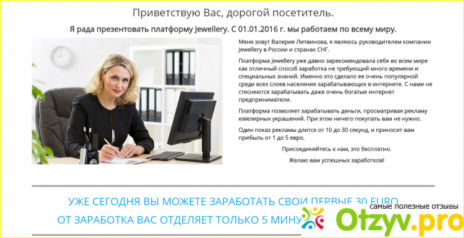 Я увидела приглашение от Валерии Литвиновой, якобы руководителем компании Jewellery, сотрудничать с ее компанией, а именно заниматься продвижением рекламных роликов по сети. За одну короткую рекламу обещают выплатить от 1 до 5 евро, всего лишь нужно зарегистрироваться на сайте.