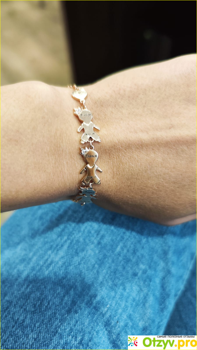 Фианиты выбрала обычные белые, потому что сама предпочитаю больше классику, ведь классика всегда в моде. Браслет состоит из трех детских фигурок – двух мальчиков и девочки, сердец по краям. Изделие выполнено очень аккуратно, чувствуется, что была проведена действительно ювелирная работа. Фигурки все ровные, симметричные, каждый камушек на своем месте. Я захотела, чтобы сердца были полностью инкрустированы камнями, там были такие модели, все показали, рассказали. Вообще персонал очень приятный и вежливый. Впечатление оставили очень приятное!