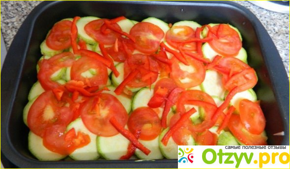 В форму для, запекания выкладываем слой кабачков, потом слой риса с фаршем. На них кружочками томаты. Потом слои повторить. Заливаем все овощным бульоном либо томатным соком. Тушить до мягкости.