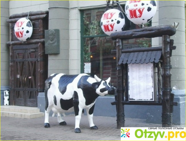Показалось удобным, что это недорогие кафе в центре, причем в самых разных местах Москвы. И когда мы с детьми приехали в столицу, то я повела их в "Му-Му" на Старом Арбате. Надо сказать, что кафе само по себе очень интересное, туда хочется зайти - у входа стоит, словно приглашая, огромная скульптура - добродушная корова. И всем своим видом показывает, что меню в "Му-Му" очень даже ничего.