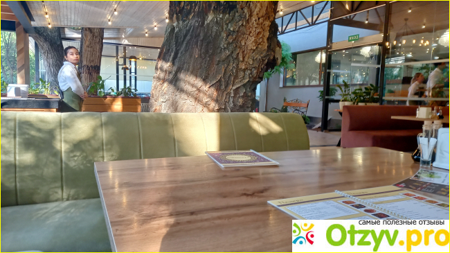 В кафе есть внутренний зал и террасный. Хотя везде есть кондиционеры, мы выбрали возможность дышать свежим вечерним воздухом. Сели напротив векового дерева, растущего сквозь крышу кафе.