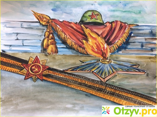 Также дети всегда рисуют каску, которая свисает и освещает сам вечный огонь, такие рисунки из детских рук всегда висят в учебных учреждениях школы, детских садов, кружков по рисованию и художественному мастерству, а лучшие работы избираются и отправляются на городскую выставку, посвященную днб победе, которая отмечается в нашей стране 9 мая.