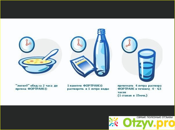 С помощью медицинского препарата «Фортранс» при соблюдении всех рекомендаций, можно отлично прочистить толстый кишечник для проведения процедуры колоноскопии. Если пациенту вдруг покажется, что его кишечник очистился не до конца, то клизму при очищении «Фортрансом» все равно делать не стоит. По инструкции, прием такого препарата лучше назначать в день колоноскопии, либо за день до нее, если колоноскопия запланирована на утро. При утреннем обследовании кишечника, следует начать принимать раствор накануне с трех до пяти часов дня. После начала приема этого слабительного пищу принимать уже не следует. Кишечник должен чиститься, и не следует его тут же засорять по новой. Принять пищу можно не позже, чем за полтора-два часа до начала приемаслабительного, чтобы пища смогла усвоиться. Следует помнить, что еда должна быть легкоперевариваемой, не перегружайте ваш желудочно-кишечный тракт. Лучше, если этой последней едой будет жидкая пища, например, сок или бульон.