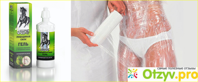 Затем надо нанести гель «Лошадиная сила! На коду тонким, ровным слоем, дать слегка впитаться. Можно наносить только на ноги и попу, а можно также на живот, спину. Следующий этап-это обматывание кожи полиэтиленовой пленкой, таким образом, чтобы не осталось зазоров. После этого, надо лечь, накрывшись теплыми одеялами, и отдыхать примерно 40-60 минут.