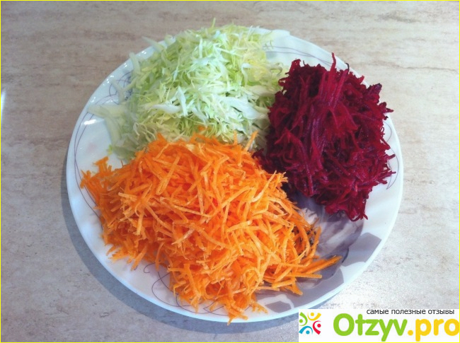 Итак , хорошо промойте овощи. Очистите морковь и свеклу от кожицы. Натрите морковь и свеклу на терке, можно использовать , как самую мелкую терку (тогда салат будет более щадящим для желудка), так и более крупную терку. Свежую капусту нашинкуйте тонкой соломкой.