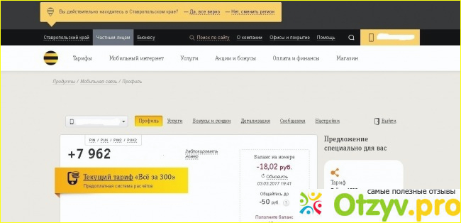 Оказавшись в личном кабинете. обязательно выберите свой город, иначе данные о тарифах и акциях могут не соответствовать. Как видно на картинке, в кабинете сразу виден тариф и баланс. Теперь вы можете отслеживать все, что происходит у вас на номере билайн.