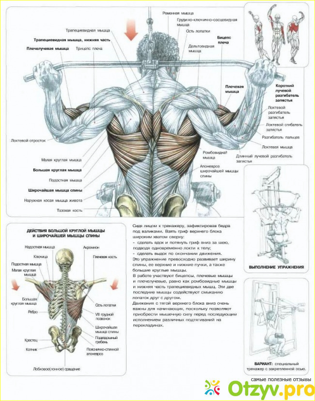 Теперь что касается тяги верхнего блока за голову. Различий выполнения этого упражнения много, я буду говорить за обычный прямой широкий хват. Мое мнение такое, что это упражнение лучше всего делать людям которые не умеют подтягиваться или подтягиваются недостаточно много. С помощью тяги верхнего блока можно значительно увеличить силу мышц спины и научиться подтягиваться больше, смысл упражнения в принципе такой же. Лично я делал это упражнение после операции, могу сказать что рост мышечной массы от него очень хороший, почти не уступает подтягиваниям. Также, я думаю, что этим упражнением лучше всего работать на рельеф спины, а именно на "прорисовку" мышц спины. Подобрав небольшой вес, можно сделать 15-20 качественных повторений, которые помогут сделать ваши мышцы спины более выносливыми, а тело более рельефным. Ну естественно что я не говорю за один подход, таких подходов и тренировок должно быть много чтобы добиться воистину прекрасного результата.
