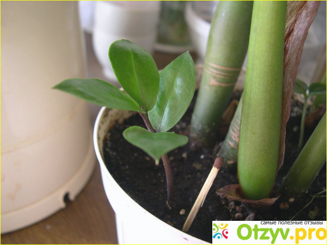 Важно следить чтобы клубень не гнил. Для этого его можно изредка доставать из земли и осматривать. Если все прошло правильно, то через 7-12 месяцев на поверхность выйдет росток, из которого вскоре появится надземная, зеленая часть замиокулькаса. И вы получите новое растение.