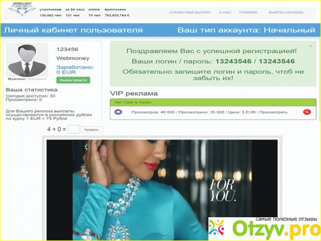 Здравствуйте! Спешу поделиться с вами своим мнением о сайте для "заработка" Данный сайт предлагает заработок в виде бонусов за просмотренные видеоролики об украшениях. Вроде бы все просто, но это далеко не так. Я искал подработку в интернете и наткнулся на этот сайт, но, к счастью не стал участником этой аферы.
