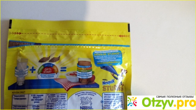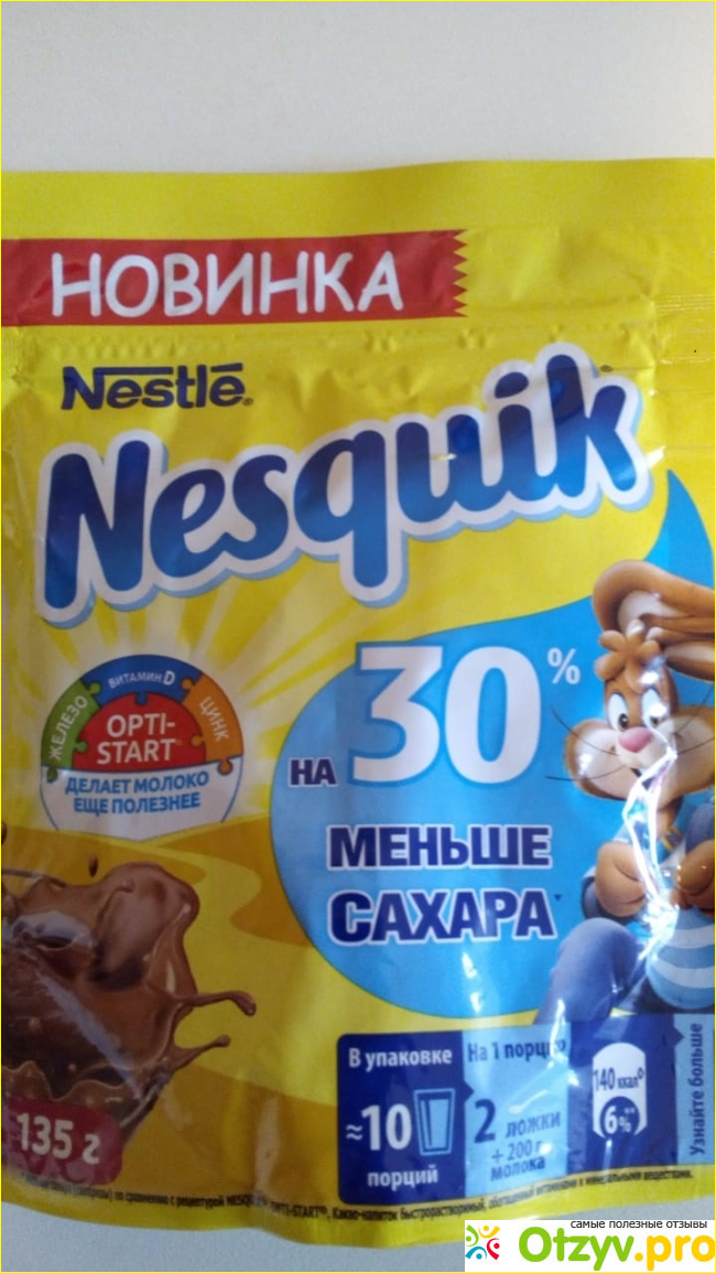 Информация производителя Nesquik также внушила доверие, то что в этом продукте на 30% меньше сахара, в упаковке хватает на 10 порций-это примерно две ложки на 200г молока.