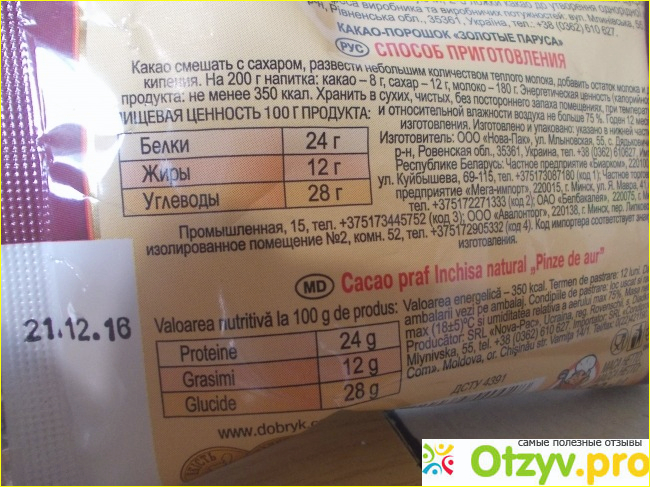 На упаковке указана вся необходимая потребителю информация и есть рецепт приготовления напитка какао.