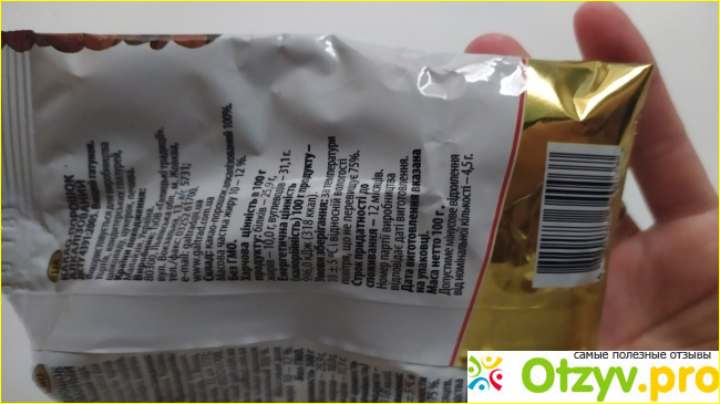 Кроме состава, на упаковке указана энергетическая ценность какао, сроки и условия хранения и информация о производителе.