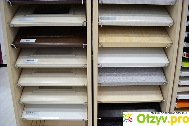 МДФ (плита, покрытая ламинатом, не токсична, простота ухода, цена тридцать условных единиц за погонный метр, неустойчива к ударам, поддается кислотам, может вздуваться).