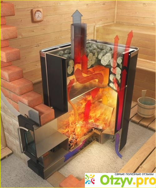 Эта модель самый лучший вариант для русской парилки. Печь имеет двухступенчатую системы образования пара. Это происходит благодаря разделению каменки на две части. Одна из них является открытой, вторая закрытой. В открытой части собирается тяжелый пар, который затем «просушивается» в закрытой части и оттуда подается наружу. Печь быстро нагревается, отличается надежностью в работе. Из минусов можно назвать лишь сильный гул.