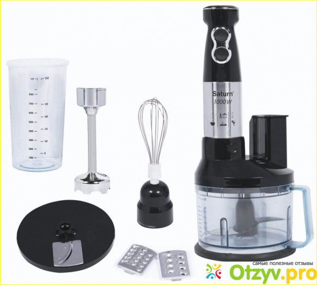 Основные характеристики очень неплохие. Мощность двигателя 1000 W, две скорости, разнообразная комплектация. В комплекте к блендеру шли стакан для взбивания объемом 600 мл, измельчитель на 900 мл, нож для рубки и измельчения, терки и венчик. Такой себе кухонный комбайн в миниатюре. И за приемлемую цену.