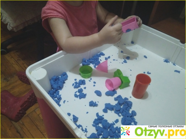 В целом песком мы довольны. Если не лениться и понимать, что любые развивающие игры, будь то лепка, рисование, аппликация потом грозят маме уборкой, то песок ни чем не проблематичнее. А ощущения во время игры просто не передаваемые. Сравнивать его с игрой в песочнице на улице не стоит, скорее с пластилином дома. Только с иными свойствами. Так, что я советую для развития и веселых игр!