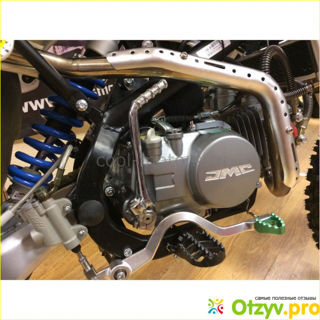 Питбайк быстро заводится, имеет вмонтированную систему воздушно - масляного охлаждения. Максимальная мощность двигателя - 17 лошадиных сил, 4 ступенчатая механическая коробка передач.