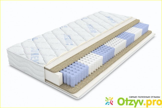 Внутри – блок независимых пружин, кокос и прочный долговечный материал, обладающий высокой степенью эластичности и хорошо пропускающий воздух.