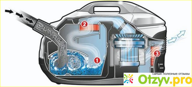 Мой новый пылесос похож на обычный, просто вместо мешка для сбора пыли у него есть емкость (три литра), которая перед уборкой заполняется водой до определенного уровня - вся пыль и мелкий мусор оседают в воде, а более большие частицы дробятся и задерживаются системой из промежуточного и HEPA фильтров.