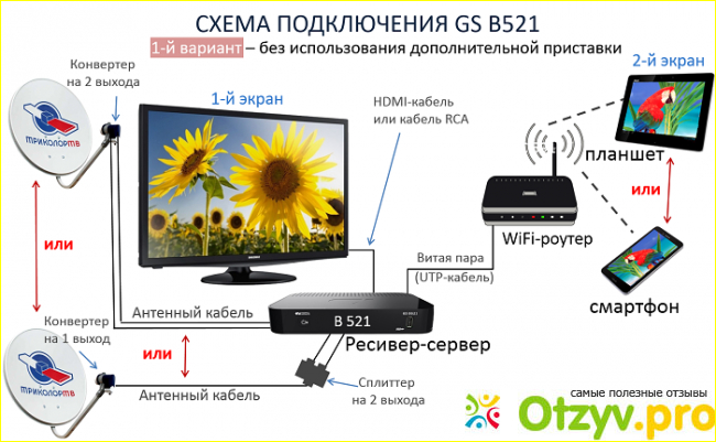 Вот к примеру, приёмник от Триколор ТВ GS- В521 является точной копией GS- В520 и GS- В522. Его отличие только в том, что у него встроены два тюнера DVSS2. Один тюнер принимает сигнал и транслирует его на экран телевизора, а второй предназначен для передачи сигнал на второй экран. Благодаря этому новшеству стало возможным подключать к этому устройству игровую приставку или второстепенный IP- приёмник GS-C 591.