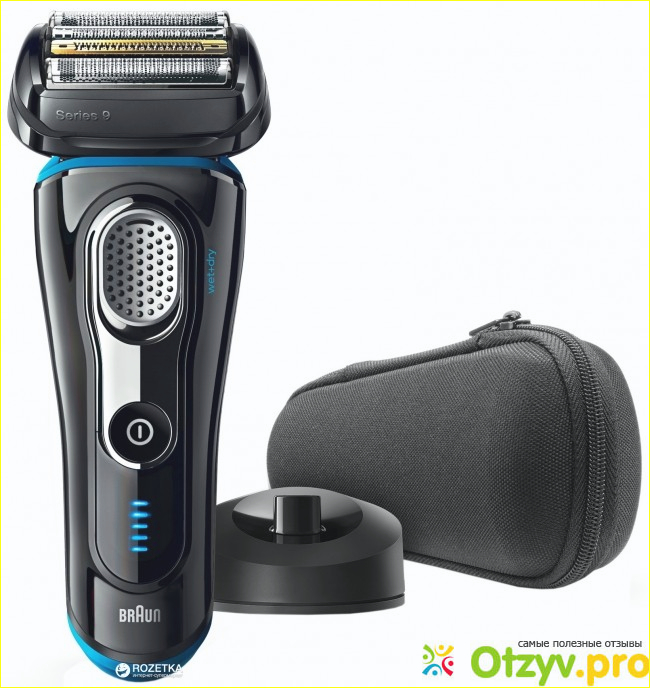 Головки плавающие, что позволяет повторять контур лица. Быстрая очистка под водой, так как имеет водонепроницаемый корпус. Быстрая зарядка от док-станции. И самое главное имеет автоматическую настройку напряжения. Снабжен индикатором низкого а также оставшегося заряда и очистки. Работает как от аккумулятора так и от сети. Батареи хватает до 45 минут автономной работы. максимум заряжается за час, а быстрая зарядка за пять минут. Оснащен дисплеем, выдвижным триммером и док-станцией для зарядки и чистки. В придачу дают щеточку для чистки и защитный колпачок.