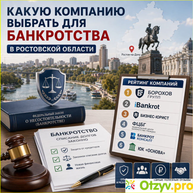 Плюсы: Региональная ростовская фирма (работает с 2010 г.). Специализируется на банкротстве и кредитных спорах. Практикует «лояльную ценовую политику» (от 7 000 ₽/мес + депозит 35 000 ₽ указано), возможна рассрочка. На сайте детально описаны этапы, есть опция личного кабинета. В отзывах пользователей высоко оценен сервис: рейтинг 5.0 (229 отзывов), клиенты благодарят за профессионализм, чистоту совета и «отсутствие скрытых комиссий».