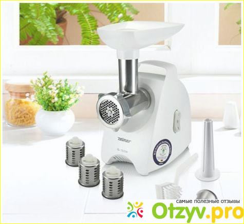 через интернет. Это была мясорубка фирмы Зелмер ММ 1200. Мы ее очень долго и придирчиво выбирали. И вы, знаете, о своем выборе не пожалели. Мясорубка просто отличная. Ее мощность шестьсот пятьдесят ватт и она справляется со своими функциями замечательно. Помимо мясорубки и ее комплектации ножа двух решеток, толкателя и шнека, в комплекте шли все вышеперечисленные насадки. Это и различные терки и шинковка. соковыжималка, а также еще и мельничка, для перемалывания кофе. Очень удобная вещь. Помимо кофе она измельчает и сахар в сахарную пудру и даже перец горошком, в перец молотый. Сама мясорубка работает тихо, и разбирается очень легко. Нажатием всего одной кнопки можно поменять насадки. Мясорубка имеет два режима роботы. Одна кнопка скоростного режима и реверс. Промыть тщательно мясорубку, а все детали очень хорошо просушить. После этого ее нужно снова собрать, и хранить так, до следующего использования.