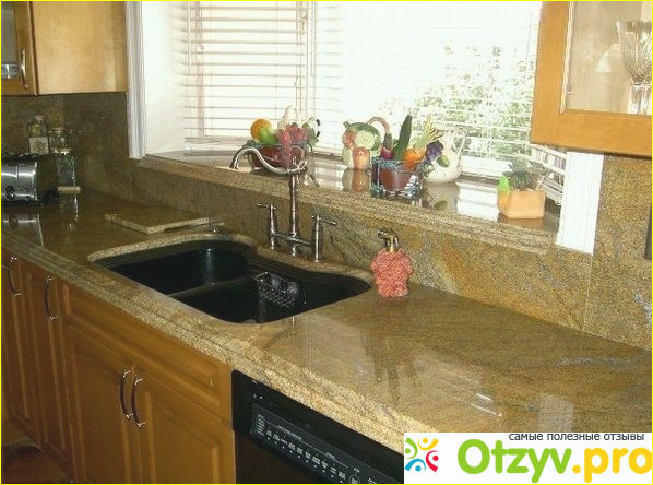 1) Натуральный камень - для изготовления кухонных столешниц чаще всего применяется природный гранит или сланец бразильский, а вот оникс и мрамор используются крайне редко. Столешницы из натурального камня всегда выглядят весьма необычно и презентабельно, но при этом и цена на них высокая.